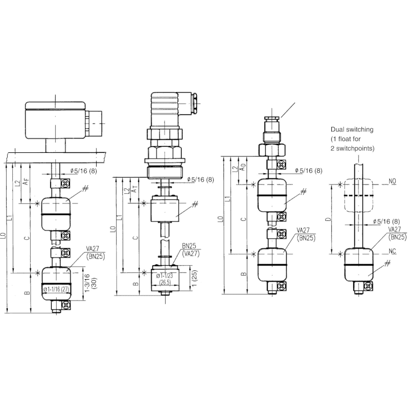 Les interrupteurs à flotteurs multiples en laiton Barksdale série UNS1000-MS avec flotteurs Buna-N sont disponibles avec 1 à 5 contacts. Ces interrupteurs de niveau à montage par le haut sont faits sur mesure à la longueur spécifiée par le client, jusqu'à 1 mètre de long. Le connecteur standard BSP 1'' permet de visser facilement le flotteur dans un manchon au dessus du réservoir.