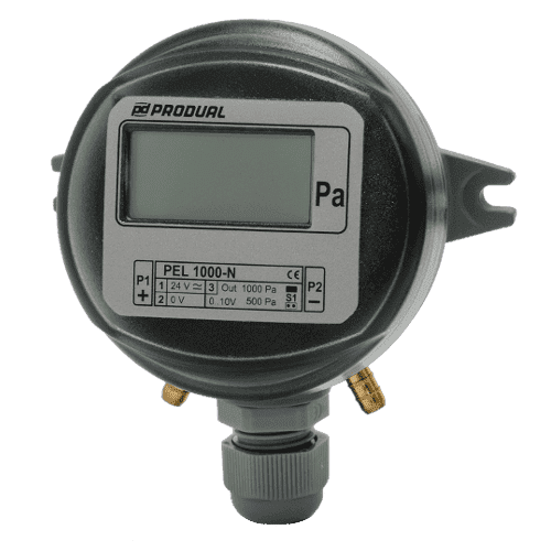La série Produal PEL1000 se compose de transmetteurs de pression différentielle simples, destinés à la surveillance des filtres et à la mesure des pressions statiques dans les conduits d’air. Sur site, la plage de mesure peut être réglée sur 500 ou 1000 Pa. Des versions optionnelles sont disponibles avec un écran et/ou une communication Modbus.