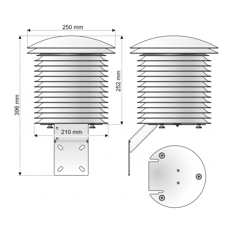 Multi-plate weerhut wordt gebruikt om weermonitorsystemen te beschermen en biedt de meest nauwkeurige klimaatmeetresultaten. Het uniek ontworpen scherm minimaliseert de zonnestraling die de sensor bereikt, minimaliseert de door het scherm geabsorbeerde straling en maximaliseert de luchtstroom rond de weerstationsensor. Het aan zonlicht blootgestelde oppervlak is gemaakt van sterk reflecterend UV- en langdurig stabiel ASA-kunststof. De binnenoppervlakken van het scherm zijn gemaakt van mat zwart plastic om interne reflecties te minimaliseren. Grote 210 mm diameter van 14 platen is ontworpen om volledige bescherming van de weersensor te bieden.